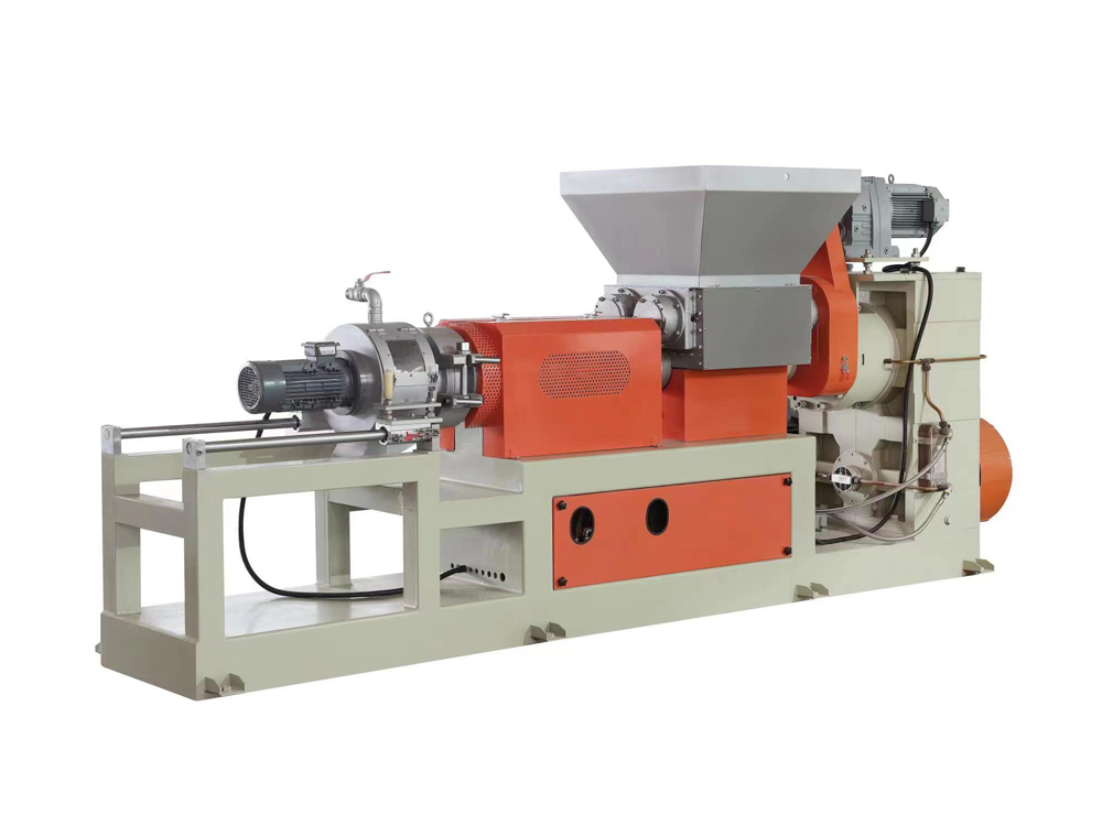 此機臺用于PVC,EVA,TPR等塑膠原料的生產,包括主機,雙腕入料,模頭切粒等系統將密煉機攪拌好的原料經雙腕擠入造粒機內經螺桿擠出后切成粒子,此機臺操作簡單
